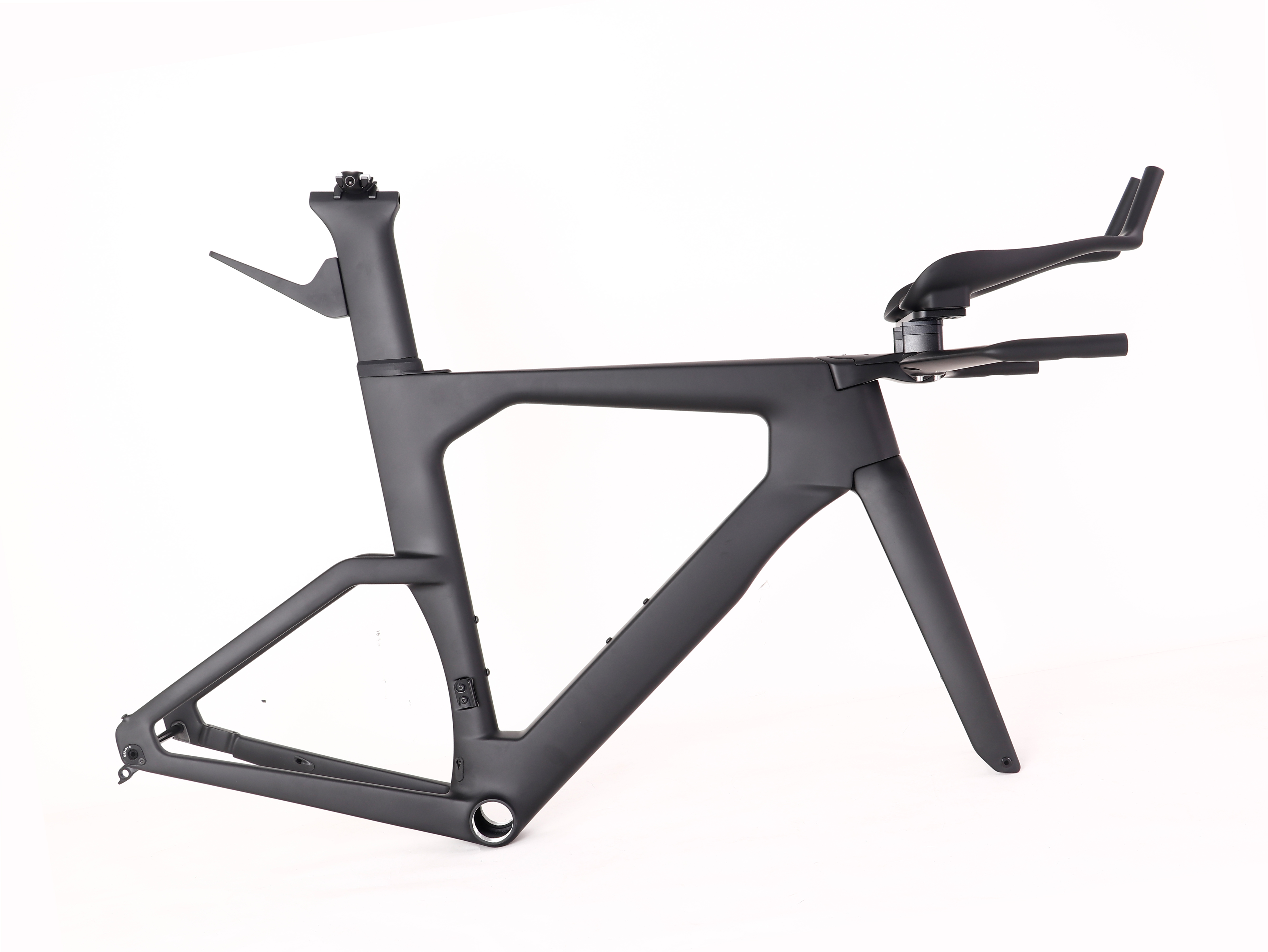 The Velobuild VB-TT-023 is a Chinese carbon fiber time trial/triathlon frameset with a T47 bottom bracket (86.5mm shell width), disc brakes, and fully integrated cable routing. It is often compared to the Trek Speed Concept in geometry. Users report it is very stiff and fast, breaking personal records. The frame weight is not explicitly stated, but complete builds range from approximately 20.75 lbs (9.4 kg) to lighter setups. The material is carbon fiber. It uses a T47 threaded bottom bracket standard. The stock cockpit includes a basebar, stem, and aerobar extensions (described as a copy of Vision TFE/Metron bars) with spacers (5mm, 10mm, 20mm) and a bridge plate for mounting. The frame typically lacks integrated storage but can be requested with threaded rivets on the top tube for a bento box. Delivery times vary, with reports from 4 days to several weeks. Build costs vary widely from around β¬1,800 to over $3,500 depending on component choices.