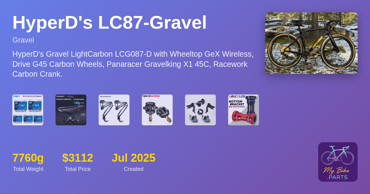 HyperD's Gravel LightCarbon LCG087-D with Wheeltop GeX Wireless, Drive G45 Carbon Wheels, Panaracer Gravelking X1 45C, RYET 3D Saddle