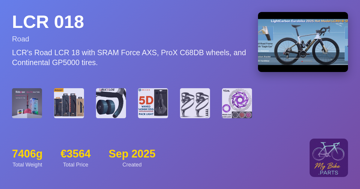 LCR 018's Road LCR 18 with SRAM Force AXS, ProX C68DB wheels, and Continental GP5000 tires.